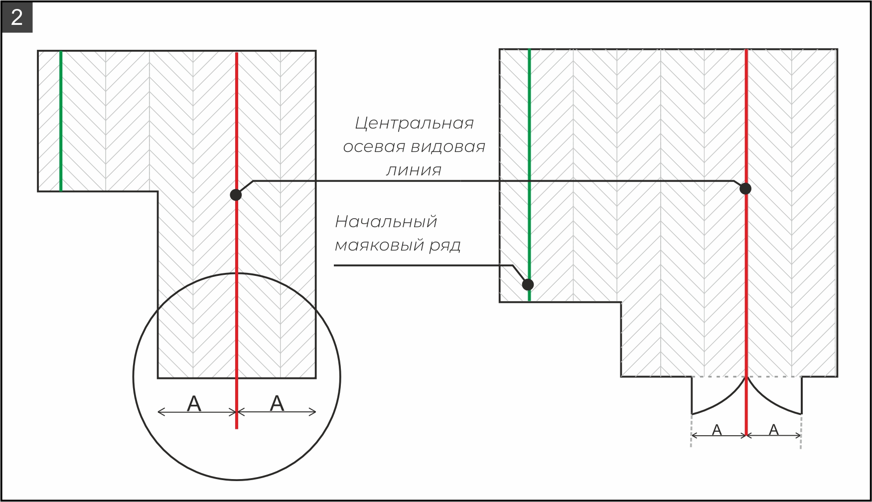 8.1. Перед укладкой проведите измерения помещений и разметочные работы: отметьте центральную осевую видовую линию. Чаще всего линию отмечают по центру длинного коридора или по центру дверного проема (рис. 2).
