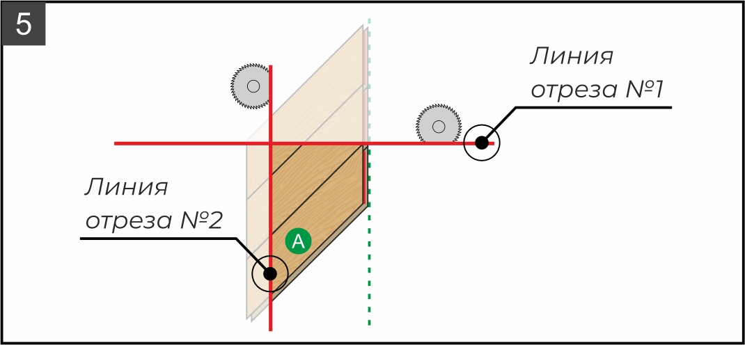9.2. Отрежьте край ряда по указанной на рисунке красной линии (она формируется в зависимости от левого угла комнаты). Исходя из расчетов (см. рисунок 5) при необходимости подрежьте плашки по длине. В зависимости от типа пилы, которую вы используете, разберите плашки и отпилите каждую по отдельности или сделайте это уже в сборке, предварительно наметив линию при помощи угольника и карандаша.