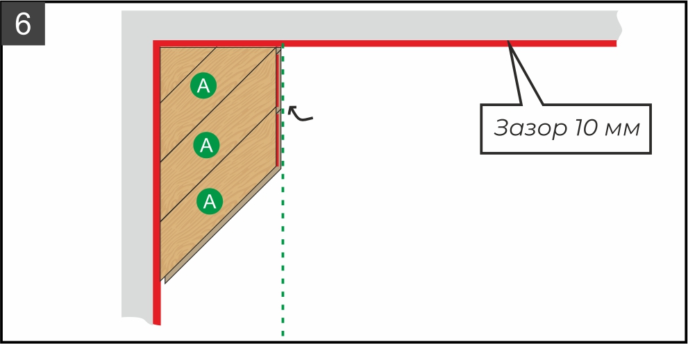 6.1. Основные монтажные деформационные зазоры необходимо предусмотреть в местах стыка края покрытия и стен, а также в местах стыка с другими напольными покрытиями и всеми выступающими из основания пола конструкциями и элементами (трубами, дверными и оконными рамами, лестницами, колоннами, перегородками, порогами, любыми крепежными элементами и недвижимыми элементами мебельных конструкций, кухонь и кухонных островов, встроенной мебели и т.п.).