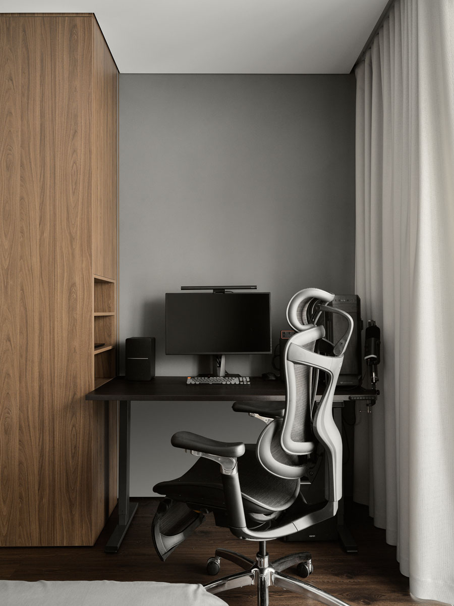 За внешним минимализмом и аккуратными стыками скрывается современная начинка: элементы умного дома, электрокарнизы, тёплый пол.
