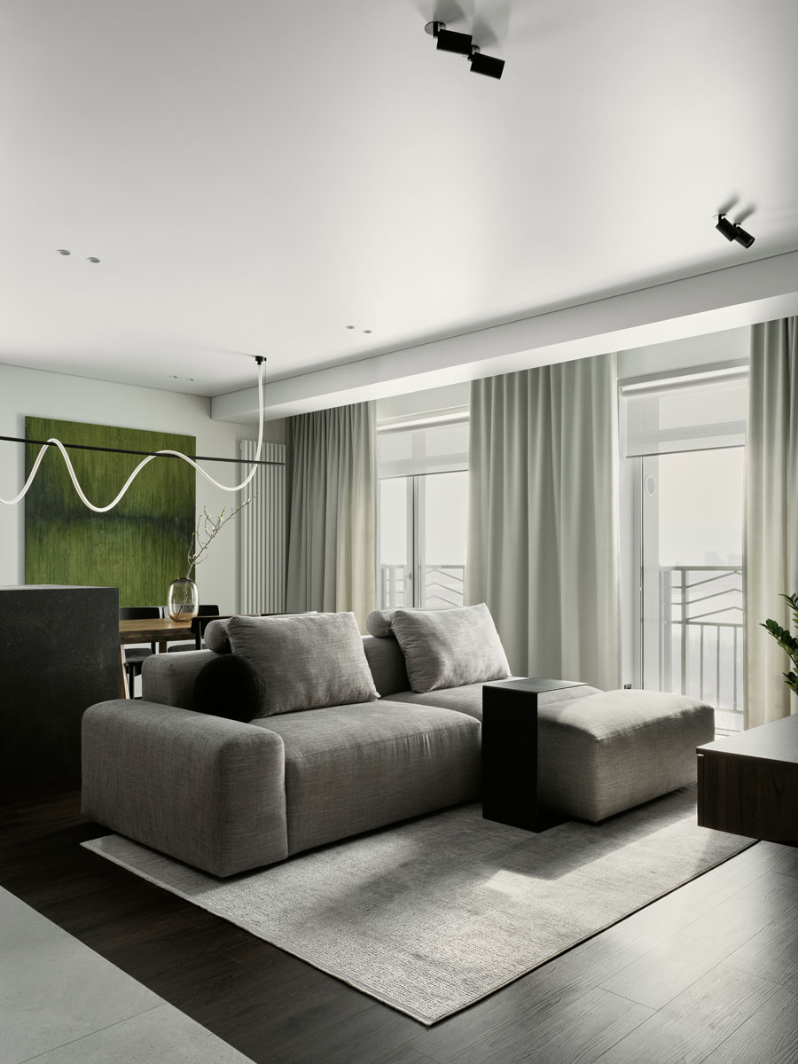 Для квартиры 97 м² с панорамным видом на Обь создали стильный и удобный интерьер по четкому запросу заказчика. В отделке объединили темное дерево, фактуру камня и природный зеленый цвет, на пол уложили практичный кварцевый ламинат Fargo.
